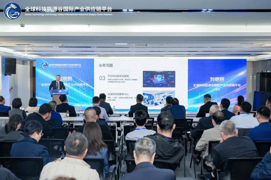 致辞环节后,全球科技能源谷国际产业供应链平台CEO刘继刚登台,详细介绍全球出海总部基地方案。他围绕国际产业供应链整合、“一带一路”沿线资源对接、企业出海全流程支撑等核心方向,系统规划了总部基地的战略定位、运营模式与发展目标,为后续合作落地提供清晰蓝图。