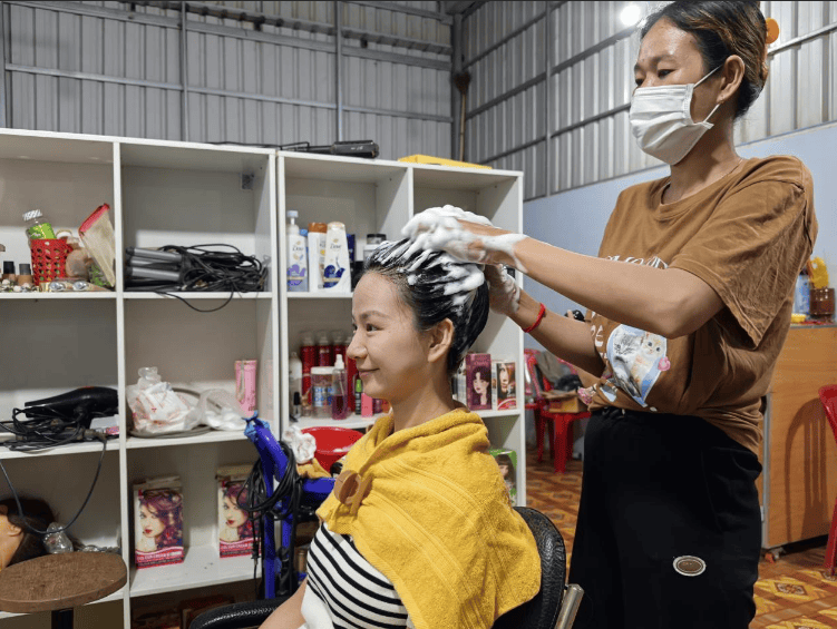 初次推門,中南半島的熱風被雕花鐵門隔絕,木地板上的鞋架靜默地提醒著入鄉隨俗的禮儀。光腳踩在微涼地板上,腳步不自覺輕緩。這間被工具櫃一分為二的小平房,前半部分擺著鋥亮剪刀梳子,後半部分是沖洗區,空氣中浮動著洗發水的清香與木屑的質樸氣息。當店主姐姐用當地語言詢問需求,語言壁壘橫亙眼前,好在有項目部翻譯同行。