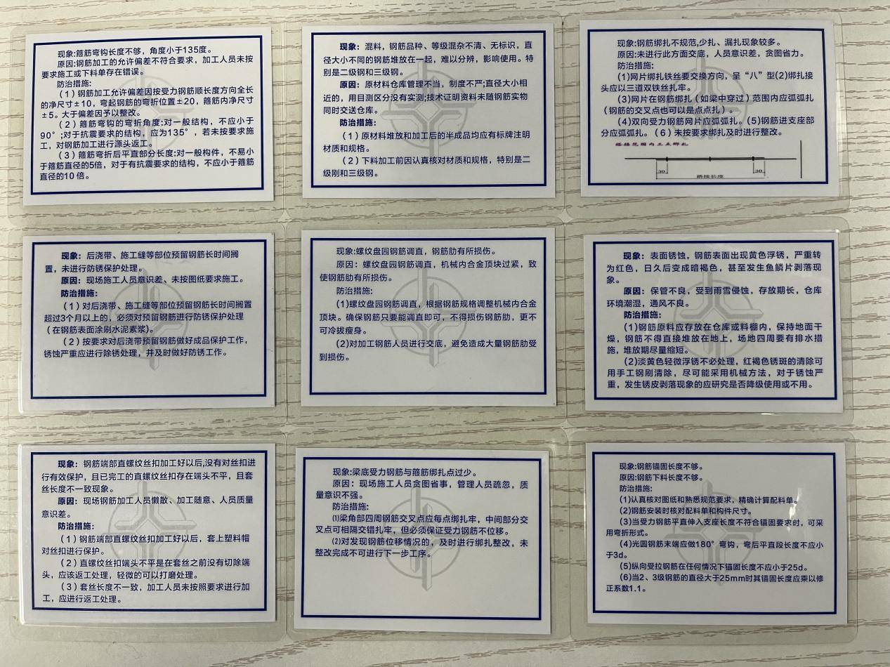 这句话像根钢钉扎进王滨心里,当晚他便带着质量攻关小组召开专题会,当小江把半年来的质量问题汇总表摊开,A3纸铺了满满一桌子。“你看这4项,几乎每个月都在重复出现。”小江用红笔圈出“钢筋机械连接外露丝扣不足”“钢筋间距过大”“丝头保护帽未设置”“模板拼缝过大”等高频词,“要是能把这些毛病贴在脚手架上就好了。”听着小江的话,王滨瞬间打开了思路:“咱们现在交底都是开大会,讲完就散,工人转头就忘。要是把关键控制点做成实物卡片,贴在现场、发到手里,是不是更直观、更实用?”