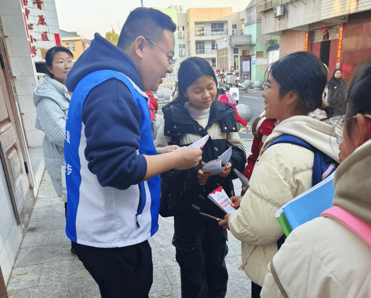 活动现场,学校门口的宣传区域早已布置妥当,醒目的横幅、图文并茂的宣传册吸引了不少师生与家长的目光。放学铃声响起,孩子们欢快地涌向活动场地,“蓝马甲”志愿者们立刻热情上前,将精心制作的防灾减灾宣传册逐一分发到孩子们手中。“地震来临时,一定要记得躲在桌子底下护住头部,千万不要慌张乱跑哦!”“火灾逃生时,要用湿毛巾捂住口鼻,弯腰低姿快速撤离!”志愿者们结合宣传册内容,用通俗易懂的语言,耐心讲解地震、火灾等常见灾害的应急避险知识,将复杂的安全常识转化为孩子们容易理解和记忆的要点。
