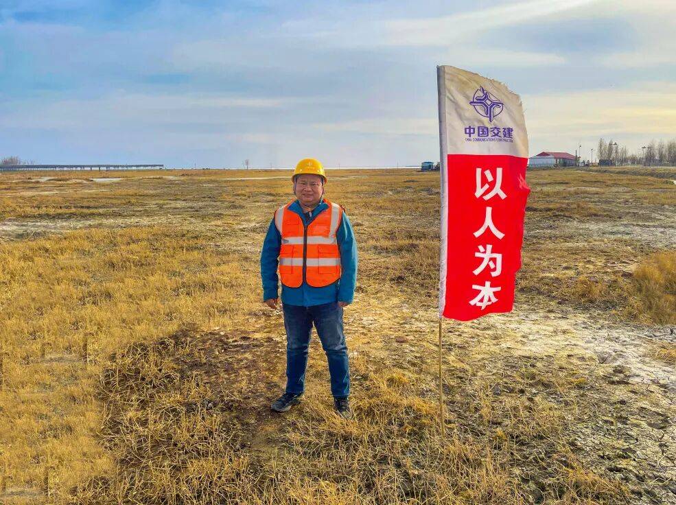 “您想在哪里拍,怎么拍?”“就在咱们工地上照!”农民工大哥要我等他一会儿。等他回来时,已经穿了一套干净的工作服,后背印着的“中国交建”熠熠生辉。他不好意思地拢了拢头发:“我是本地人,想记录一下这片盐碱地现在的样子,让孩子们看看我为家乡做了什么。”