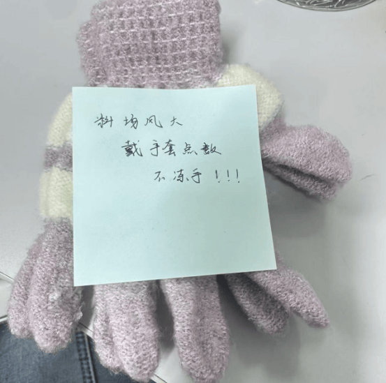在中交一航局四公司天津地铁项目部料场,一份藏在工具箱夹层里的关怀,让冬日的寒风也暖意融融。近日,项目部青年职工在整理料场工具箱时,意外发现一副崭新的棉手套和一张暖心便签,这是老同事陈姐悄悄留下的心意。
