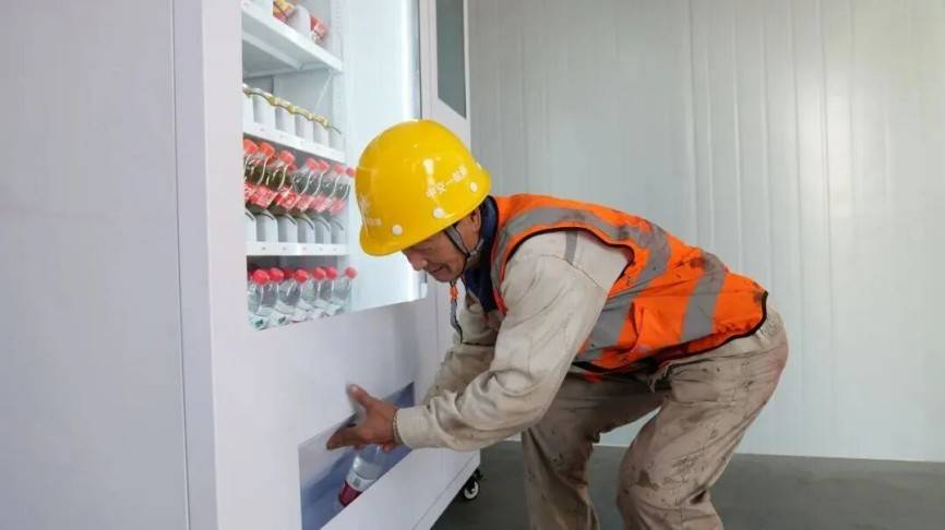 随着几声清脆的提示音响起,矿泉水、洗发水顺利地从出货口掉落,兑换了生活用品的工友们有说有笑,踌躇满志准备赚取新的积分……