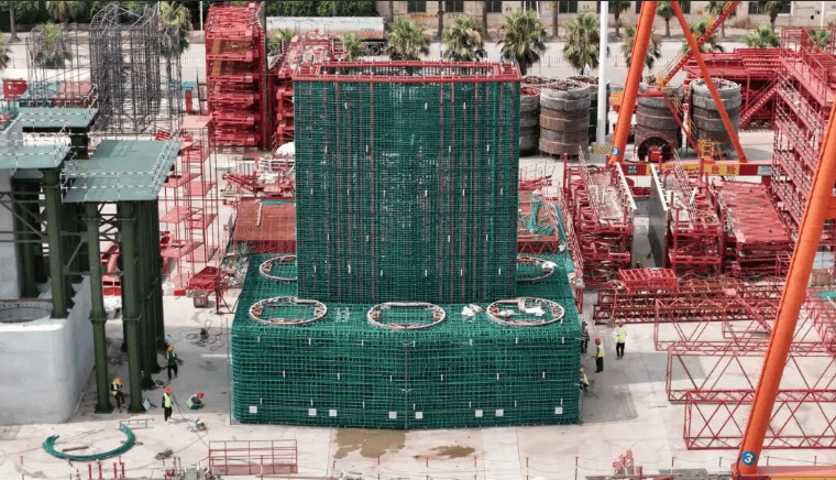 面对这一难题,项目团队集思广益,围绕如何“撬动”起模板提高效率展开讨论。“能不能找到装置,轻松‘撬动’起模板?”项目专家刘长义比划着:“用大小不一的环状相叠的模具,共同托举后浇孔模板中间的支架,再用螺栓进行调整如何?”这一思路让大家眼前一亮。工人将支架固定在小环形模具上,通过内外螺栓微调,实现上下左右精准调整。只需保证两个环状模具螺栓开口位置相同,就可以通过拧动螺栓内、外旋,进行上下左右位置。经过近30天模拟推演,团队还用BIM建模优化钢筋插入口,最终掌握了后浇孔模板精准调节“窍门”,施工精度达到毫米级。