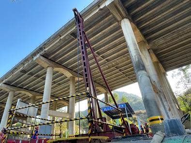 项目首件桩基在华子山高架桥区域,施工条件极为复杂。桥梁需上跨106国道,其梁板、盖梁拆除及钢混梁架设作业受限于桥下最小净空,且106国道日常交通繁忙,施工期间需保障道路正常通行不中断;同时,桥址区域106国道北侧存在国防光缆、南侧紧邻民房,对施工安全防护和周边环境保护提出极高要求。针对这些难点,项目部提前谋划,在满足大交通组织要求的前提下,分阶段细化施工方案与交通导改方案,对施工区域设置多重安全防护设施,建立专项管控机制,全程严守安全与环保底线。