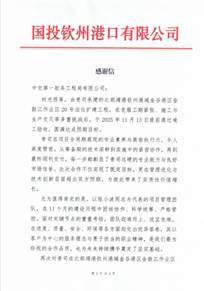 近日,中交一航局收到国投钦州港口有限公司发来的感谢信,对公司圆满完成北部湾港钦州港域金谷港区金鼓江作业区 20 号泊位扩建工程表示高度认可与诚挚谢意。