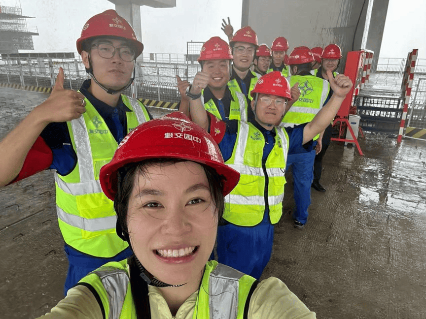 朝阳的光刚撒在现场,骤雨忽至,豆大的雨点砸下来,转瞬就把大家淋成了落汤鸡。镜头里,安全帽上的水珠顺着帽檐成串滴落,工装紧紧贴在身上,但青年们没有四散躲避——技术员张雨坤攥着台词对镜头讲解,中交一航局五公司狮子洋项目部安全员黄林飞演示应急设备操作,动作依旧标准利落。