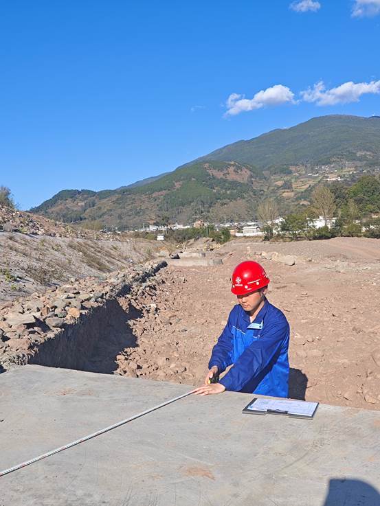 作为中交一航局五公司云南宾川项目部的技术员,他的日常工作始终与忙碌相伴。天刚蒙蒙亮,他就带着测量仪器和设计图纸赶往现场,踩着没过脚踝的泥泞河滩采集数据,蹲下身仔细检查护坡的每一道细小裂缝,详细记录淤泥堆积和堤岸被冲刷的具体情况。正午烈日炎炎,他顶着高温核对施工方案,和施工人员逐一确认技术细节,反复强调护坡加固、清淤疏浚的各项规范;一旦遇到突发风雨,他立刻奔赴危险河段,在泥泞中深一脚浅一脚地排查排水问题,确保汛期洪水能安全通过。