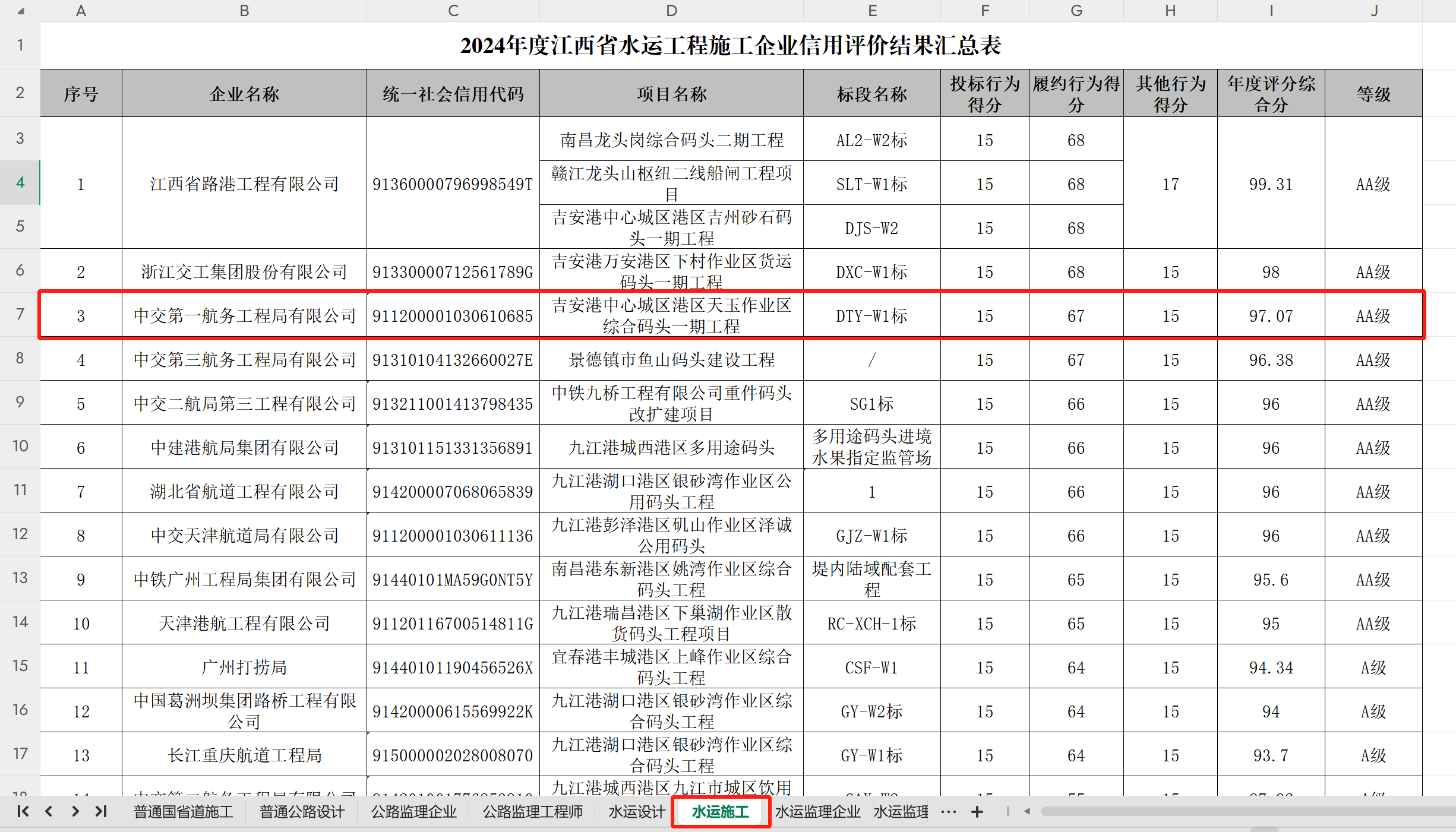 喜报!吉安项目部助力一航局斩获江西省水运工程信用评价“AA”最高等级